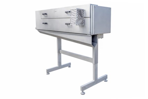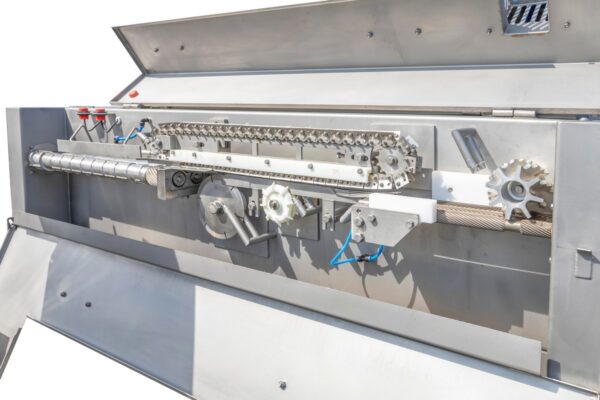Żołądek wpada przez otwór wlotowy na wałki, które transportują go na kolejne etapy przetwarzania: oddzielenie pakietu jelit, rozcięcie, czyszczenie i zdjęcie skóry z wnętrza. System prowadnic stabilizuje żołądki i ustawia je w pożądanej pozycji względem kolejnych narzędzi obróbczych. Woda dostarczana do wnętrza automatu, wspomaga przesuwanie się żołądków i dokładnie wypłukuje zgromadzone nieczystości.