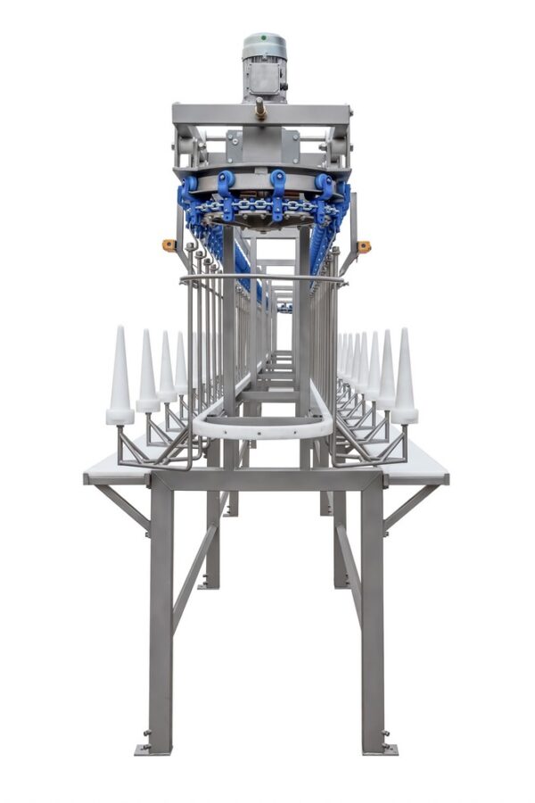 Wielkość tworzywowych uchwytów, na które nasadza się wypatroszone, przygotowane do dzielenia tuszki dostosowuje się do wielkości dzielonego drobiu. Zależnie od potrzeb zamawiającego (od wydajności i rodzaju dzielonego drobiu) można wykonać dzielarkę o różnych długościach. Jej konstrukcja zezwala również na rozbudowanie urządzenia w przyszłości. Prędkość dzielarki – przenośnik jest płynnie regulowana, co umożliwia jej dostosowanie do aktualnych potrzeb użytkownika, wydajności oraz kwalifikacji obsługi. Stanowiska pracy rozmieszczone są po obydwu stronach urządzenia. Konstrukcja przenośnika umożliwia różnorakie zorganizowanie dostaw drobiu i odbioru surowca – na przenośnikach taśmowych, w skrzynkach, w wózko wannach itd.