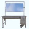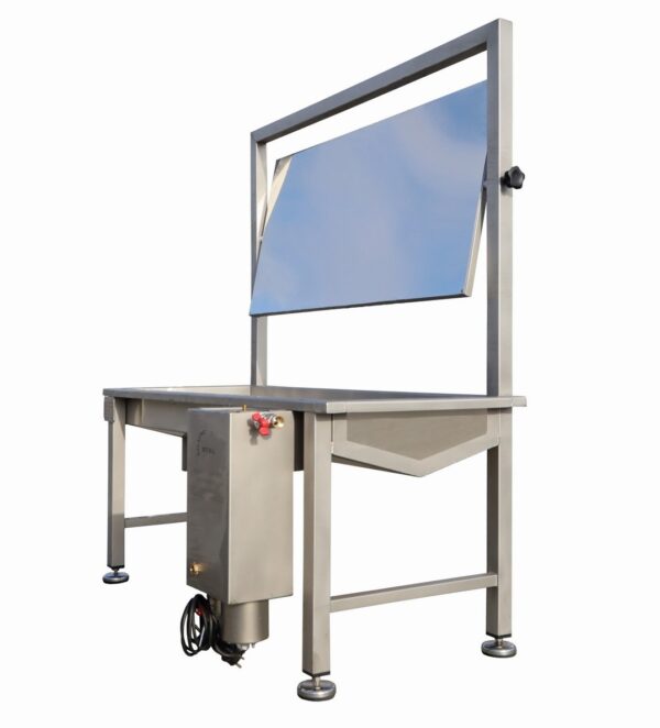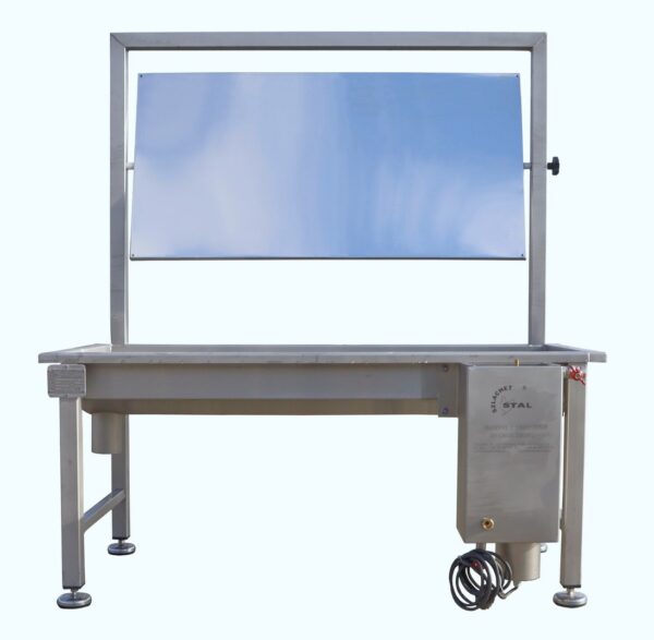 Do konstrukcji wsporczej wykonanej z materiałów nierdzewnych, kwasoodpornych zamocowana jest wanna nierdzewna nad którą przesuwają się strzemiona z drobiem transportowane przez przenośnik podwieszony. Stanowisko badania powinno być umieszczone w odpowiednim miejscu (po wyjęciu pakietu z wnętrza tuszki). Zamocowane na konstrukcji wsporczej lustro daje lekarzowi możliwość dokładnego obejrzenia tuszki drobiowej (z dwóch stron). Stanowisko wyposażone jest również w sterylizator narzędzi, ciepłą wodę uruchamianą przez zawór kolanowy z wyłącznikiem czasowym co zapewnia lekarzowi higieniczne przeprowadzenie badań.