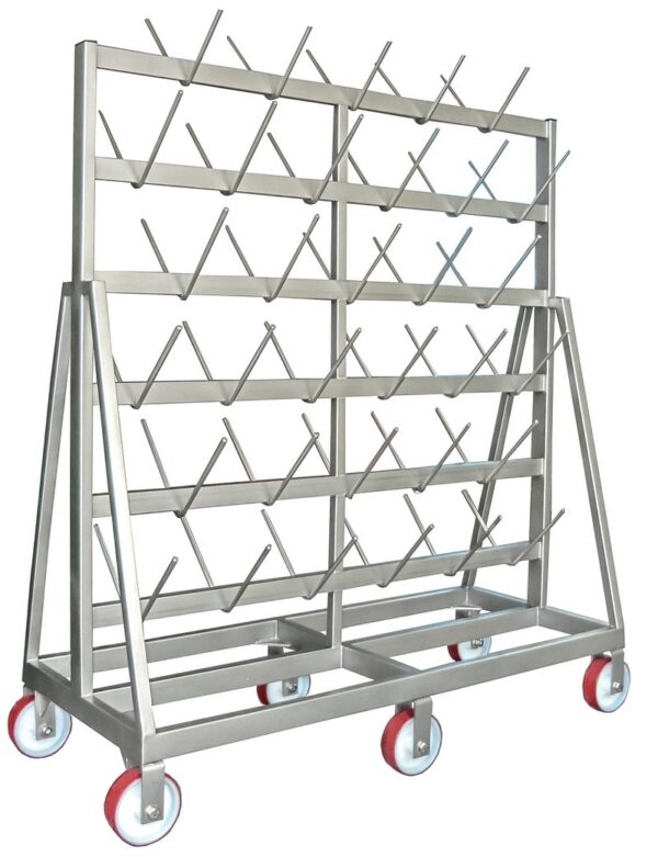 Wózek jest wykorzystywany po procesie schładzania wodnego i służy do osuszania tuszek. Rozmiar wózka oraz haków do zawieszania jest dobierana do wielkości i rodzaju ubijanego drobiu. Konstrukcja wózka jest solidna i stabilna, a zamocowane koła, pozwalają na łatwe transportowanie tuszek drobiowych.